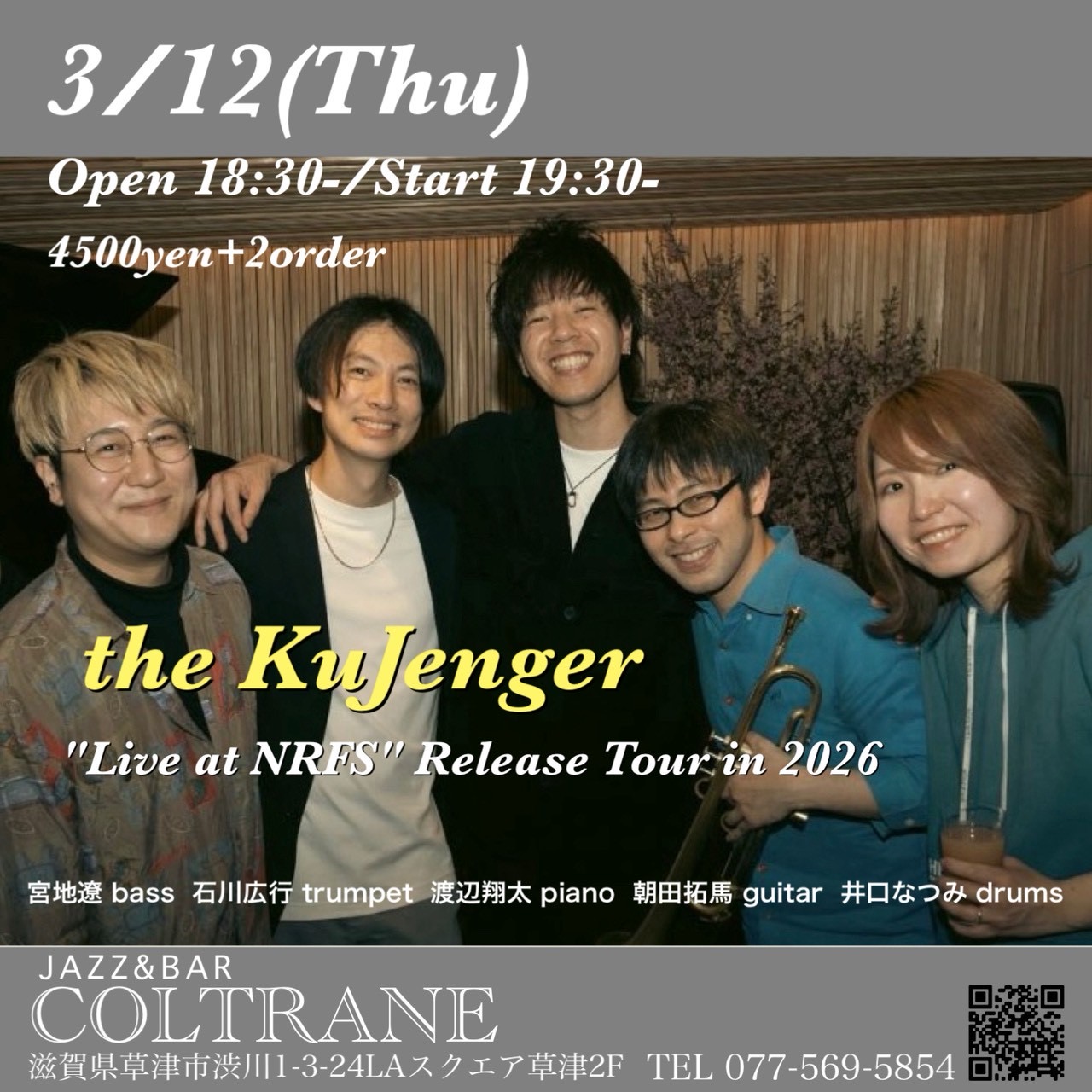 「the Kujenger Live album❝Live at NRFS❞リリース記念ツアーin 2026」宮地遼(Ba)石川広行(Tp)渡辺翔太(Pf)朝田拓馬(Gt)井口なつみ(Ds)